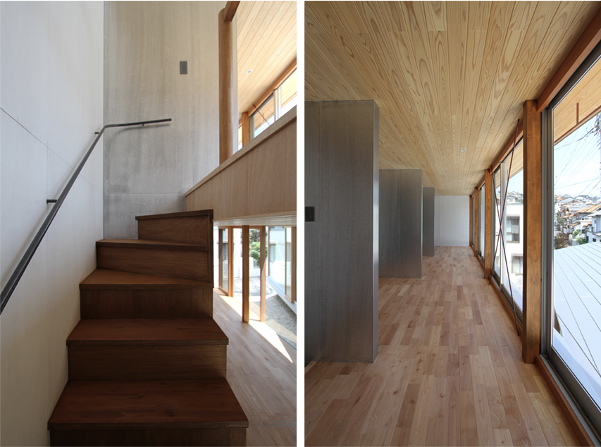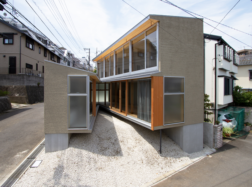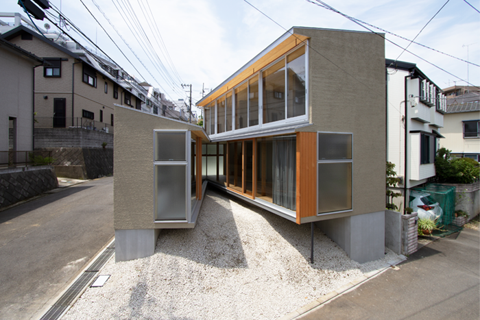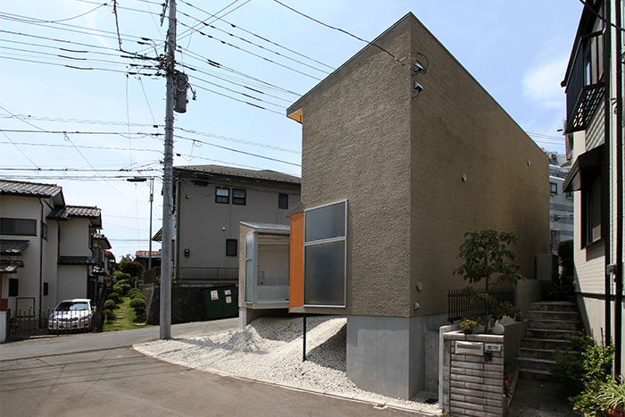 この地域一体には谷戸が続いており、敷地は谷状の地形の底にあります。さらに変形した角地の狭小地という条件で、建築できる面積も、眺望を得られるような方位も限られていました。