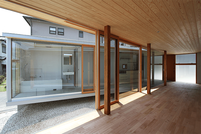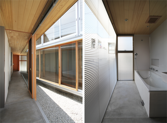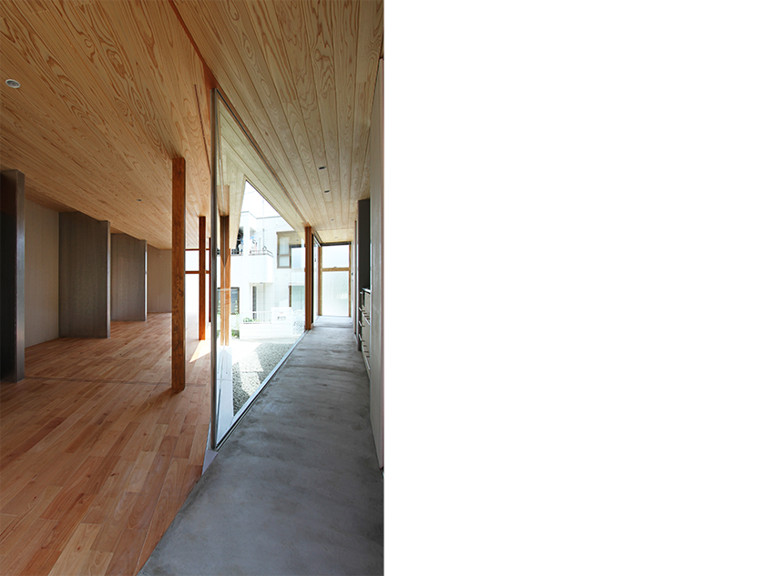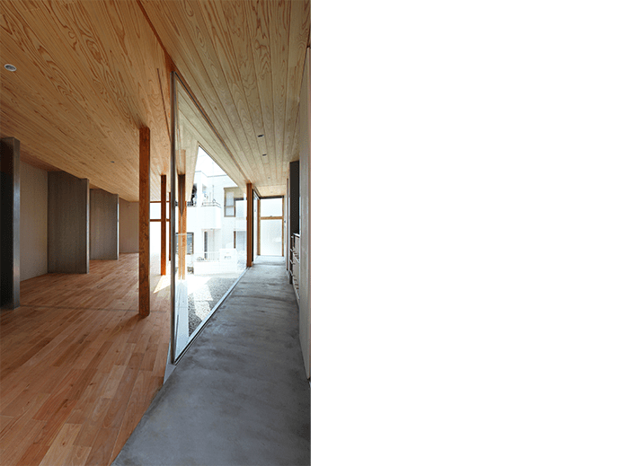 By dividing the building according to the functions of "living room building" and "water ridge building" and joining them at one point,We set up a courtyard cut at an acute angle like Crevasse (a crack that can be formed in a glacier). Also, by concentrating the structural walls on the outside, the openings are concentrated on the inside.This widely opens to the outside while creating a mysterious area with moderate privacy.