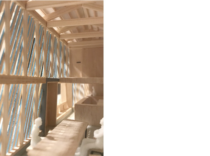 As a result, the structure and design are integrated to realize a structural wall that captures light. In addition, by using a corrugated plate made of organic glass for the outer wall and coloring the edges of the brace in blue, a visual effect that changes the image depending on the viewing angle is brought about.To finish the room, we use "Tosa Washi", which is a special product of the Niyodo River basin, to ensure heat insulation.